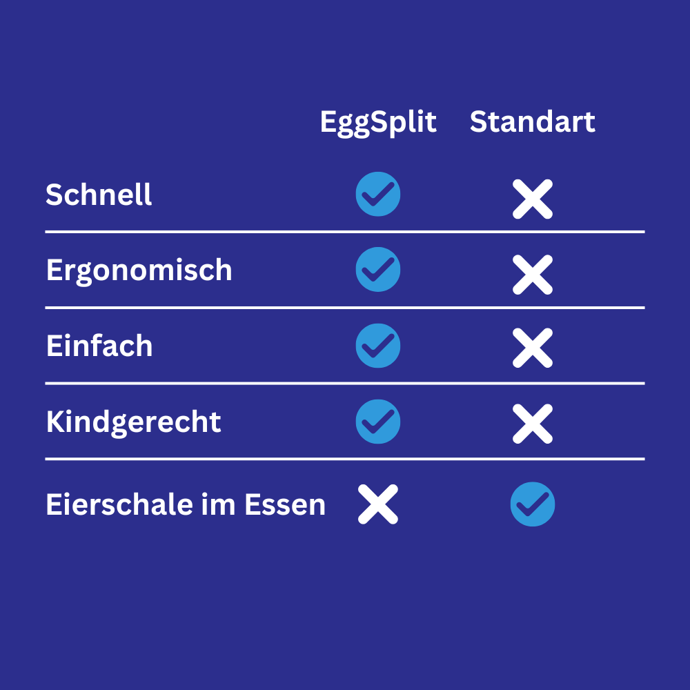 Schluss mit Schalenchaos, klebrigen Fingern und lästigen Schalenresten im Ei – wir haben die Lösung! Mit unserem innovativen EggSplit wird das Eieröffnen so präzise und einfach, dass Du den Kochspaß wieder genießen kannst. Egal ob roh, groß oder klein – EggSplit sorgt für saubere Schnitte ohne Aufwand. Verabschiede Dich von umständlichen Methoden und entdecke die neue Art, Eier zu öffnen – schnell, mühelos und perfekt!