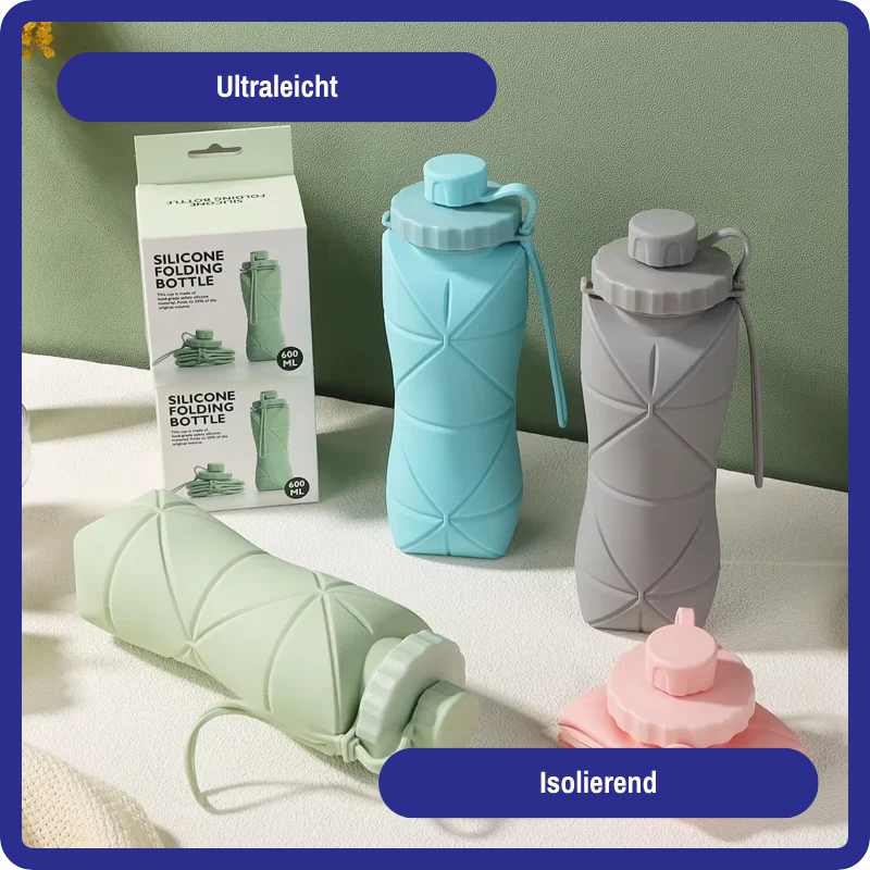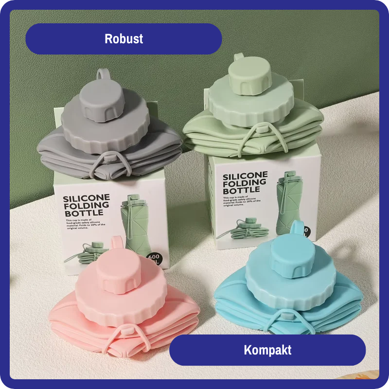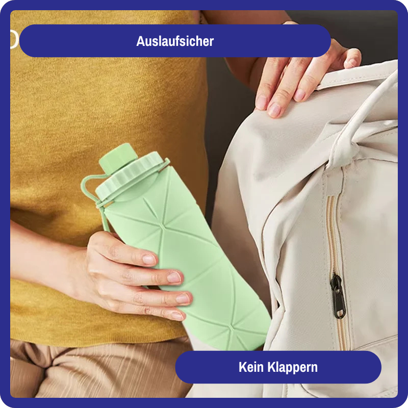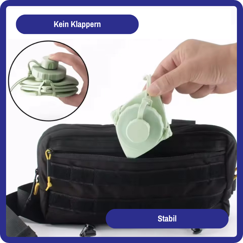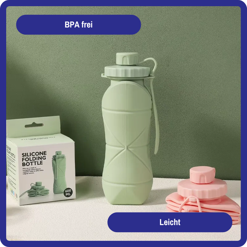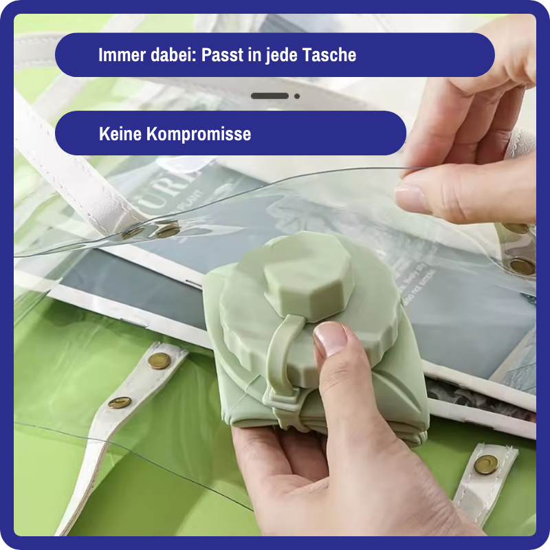 Gefertigt aus lebensmittelechtem, BPA-freiem Silikon ist sie extrem leicht und gleichzeitig robust. Kein Glas, das zerspringt. Kein Plastik, das splittert. Einfach ausrollen, befüllen, trinken – fertig. Du brauchst keine Spezialpflege: Spülmaschine, Hitze oder Kälte? Kein Problem.